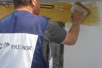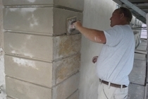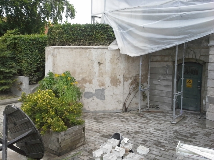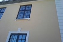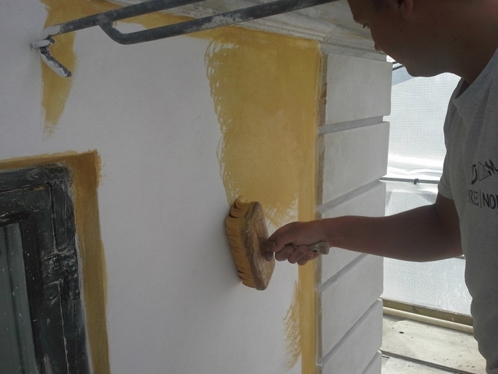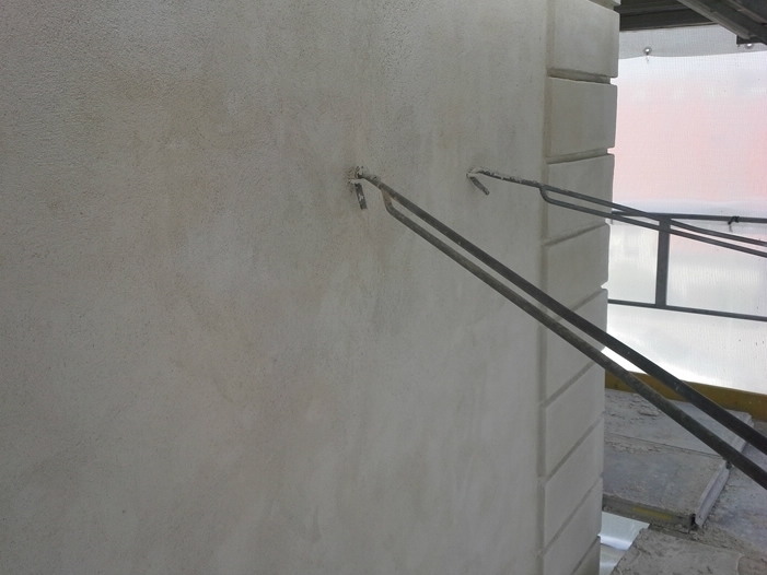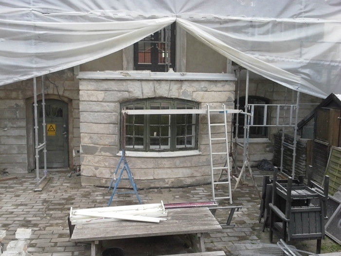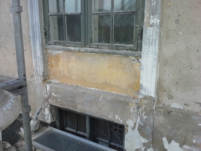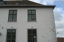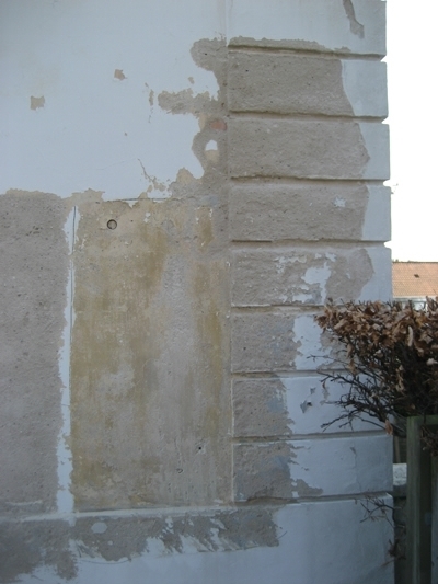 Inden vi gik i gang med at genpudse facaderne, har vi foretaget en afrensning af facaderne, og store partielle løse og skrugne flader blev banket ned. Der er foretaget forstærkning af facaderevner ved indmuring af stålarmeringsjern og nyt facadepudslag er blevet opbygget.
